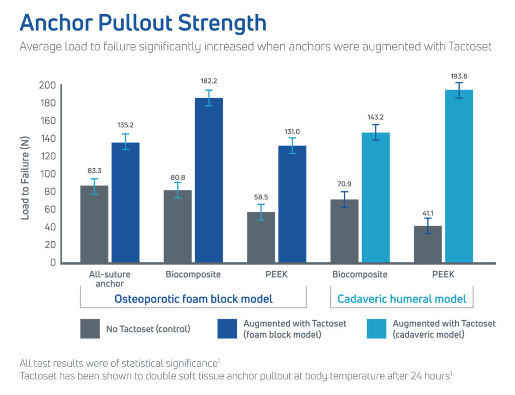 When used to augment soft tissue anchors, Tactoset significantly increases pullout strength, which is especially beneficial in osteoporotic bone or in areas weakened by cysts or arthritis