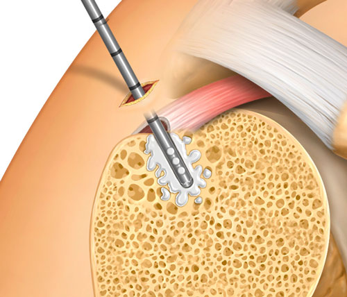 Using Tactoset to augment hardware increases fixation strength and the density of poor-quality bone caused by cysts, osteoporosis, or osteoarthritis. When using Tactoset with suture anchors, it allows the hardware to be placed securely in the ideal repair location and can achieve greater than twice the pullout strength of non-augmented anchors.1,3